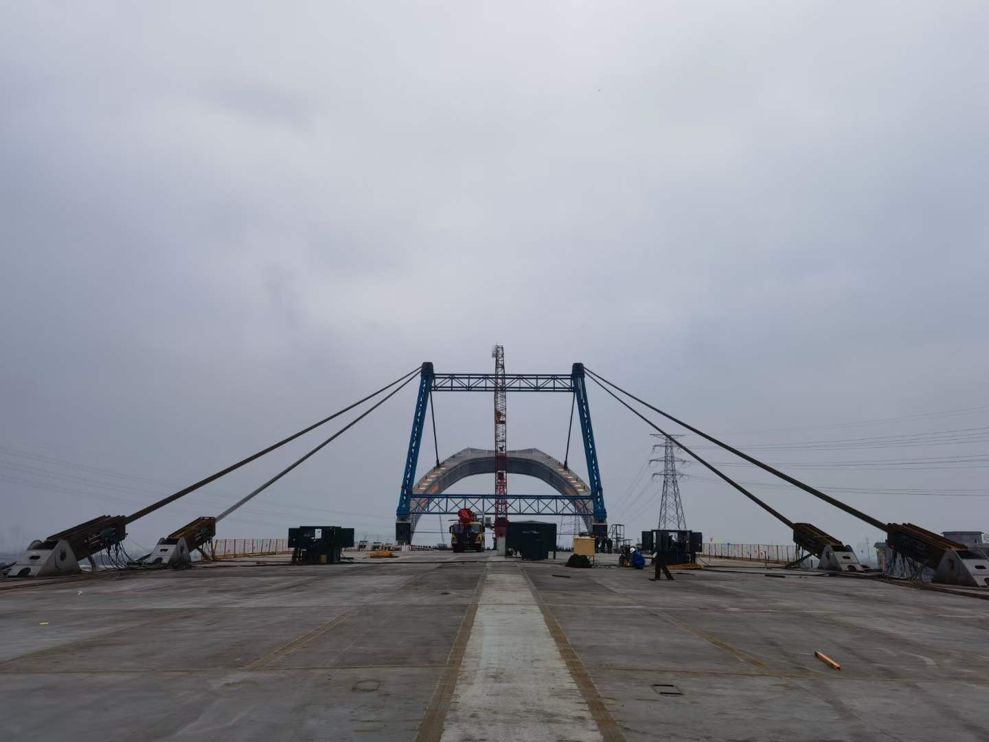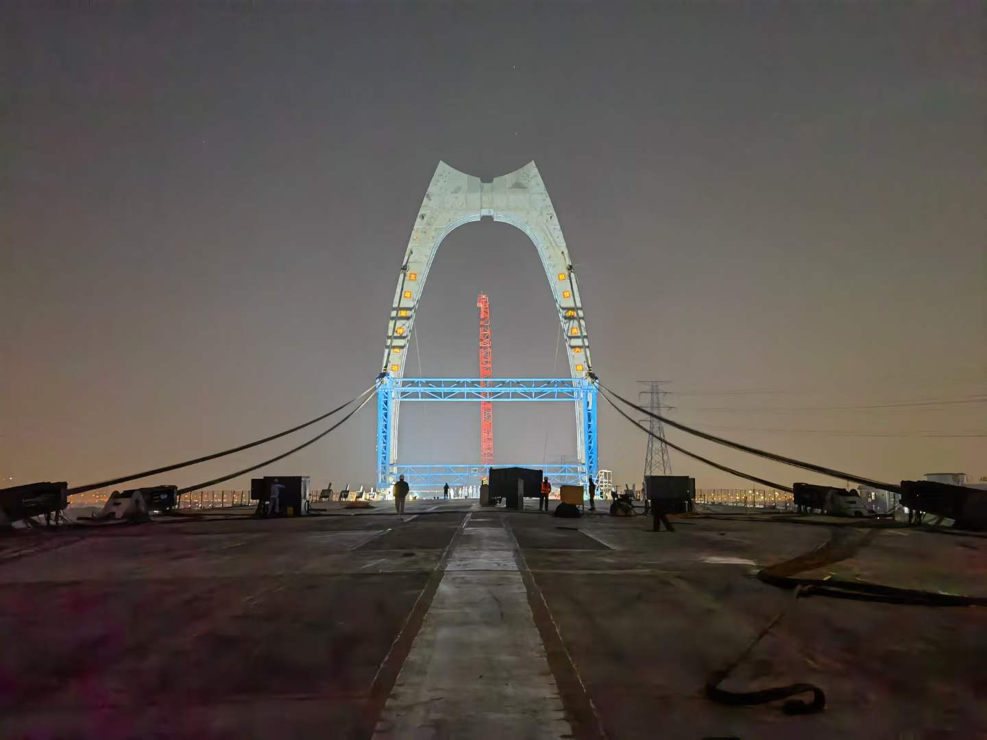 2022年1月18日,經(jīng)過16小時的連續(xù)施工,寧波西洪大橋主橋鋼塔完成了節(jié)點性工序—主塔90°豎轉,轉體施工由上海同新機電控制技術有限公司負責完成。主塔外形為弧形門式,采用“臥式拼裝,整體豎轉”