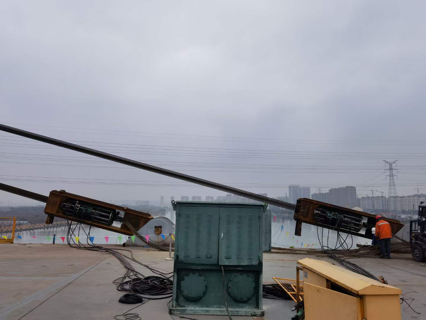 西洪大橋鋼主塔整體轉體重量約1150t,轉體為角度90°,拉索使用4x560t油缸,背索使用2x200t油缸,拉桿采用4x37x17.8鋼絞線。
