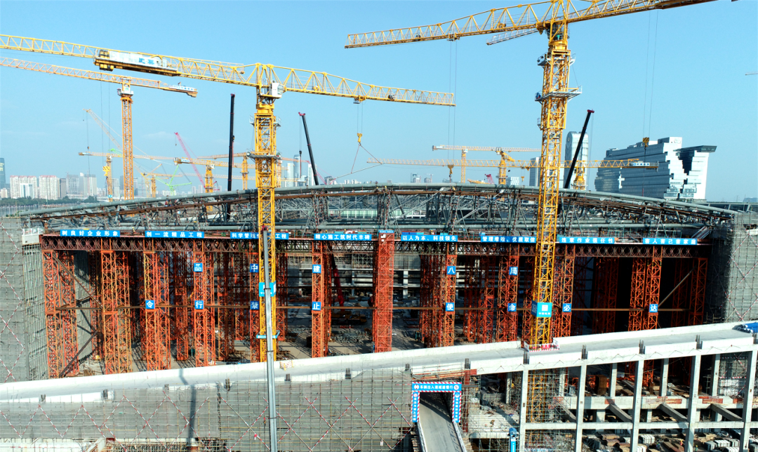 3月20日上午,隨著6臺400t液壓千斤頂緩緩下落,由中建八局承建的廣交會展館四期項目過95天日夜奮戰(zhàn),迎來展廳鋼屋蓋全面封頂,為2022年秋交會投入使用奠定了堅實的基礎(chǔ)。鋼屋蓋滑移落架施工由上海同新機電控制技術(shù)有限公司負責完成。鋼屋蓋為倒三角桁架結(jié)構(gòu),施工過程中,采用“定位拼裝、分段滑移”工藝,將4個主展廳的24榀桁架,劃分為8個滑移單元,依次在高空平臺進行獨立拼裝,并采用“液壓同步滑移施工技術(shù)”,以液壓爬行器為驅(qū)動設(shè)備,將跨度119.5米的屋蓋鋼結(jié)構(gòu),以每小時12-15米的速度向前推進,實現(xiàn)鋼桁架同步滑移、正確落位,每個展廳6榀桁架,每3榀桁架作為一個滑移單元,單個滑移單元重量約1200t。施工順序為:C4屋蓋→C3屋蓋→C2屋蓋→C1屋蓋。滑移總重量約10500t,至遠滑移距離為400米。
