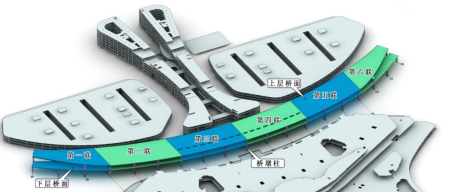 北京新機場航站樓是雙層出發(fā)、雙層到達設計的航站樓,一二層分別是國際、國內到達層,三四層分別是國內、國際出發(fā)層。新機場雙層出發(fā)高架橋旨在滿足航站樓陸側7200萬旅客量的交通需求,并與航站樓內部功能相匹配。航站樓前雙層離港橋主橋橋梁共計6 聯18 跨橋,上下層橋梁總面積約51909 平米。高架橋橋面整體為曲線形,其中第2聯至第5聯為等寬曲線形橋面,兩端的第1聯和第6聯為變寬段橋面。