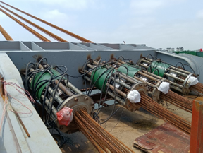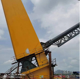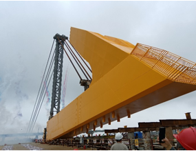 2023年8月5日,經(jīng)過10個小時的連續(xù)施工,一座重達(dá)1246噸的南主塔成功在杭州灣大道跨十一塘橋上實現(xiàn)豎轉(zhuǎn),標(biāo)志著該工程施工難點北塔和南塔主體全部被攻克。杭州灣大道跨十一塘江橋梁工程于2021年3月開工,按一級公路兼顧城市主干路標(biāo)準(zhǔn)建設(shè),主線長度為1057米。橋梁橋型為全鋼結(jié)構(gòu)雙塔中央索面斜拉橋,主橋跨徑192米,橋塔采用帆船造型,主塔高約60米,塔柱往主跨方向傾斜與水平夾角70度。北塔已于2023年5月30日豎轉(zhuǎn)到位,本次豎向轉(zhuǎn)體施工的為南塔。豎向轉(zhuǎn)體施工技術(shù)難度大,建設(shè)方邀請專家對內(nèi)傾鋼塔臥拼扳起豎轉(zhuǎn)施工工藝進行了深入探索研究,通過一種臨時支承體系作為鋼塔臥拼胎架與壓桿牽引拉索、臥拼鋼塔組成自平衡三角豎轉(zhuǎn)結(jié)構(gòu)體系,利用4臺大型同步牽引油缸,以主塔轉(zhuǎn)鉸為中心,成功將鋼塔臥拼豎轉(zhuǎn)。