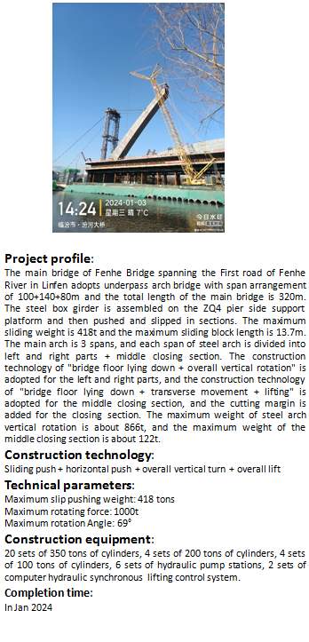 臨汾汾河大橋主橋鋼箱梁滑移頂推、主拱豎轉(zhuǎn)提升工程