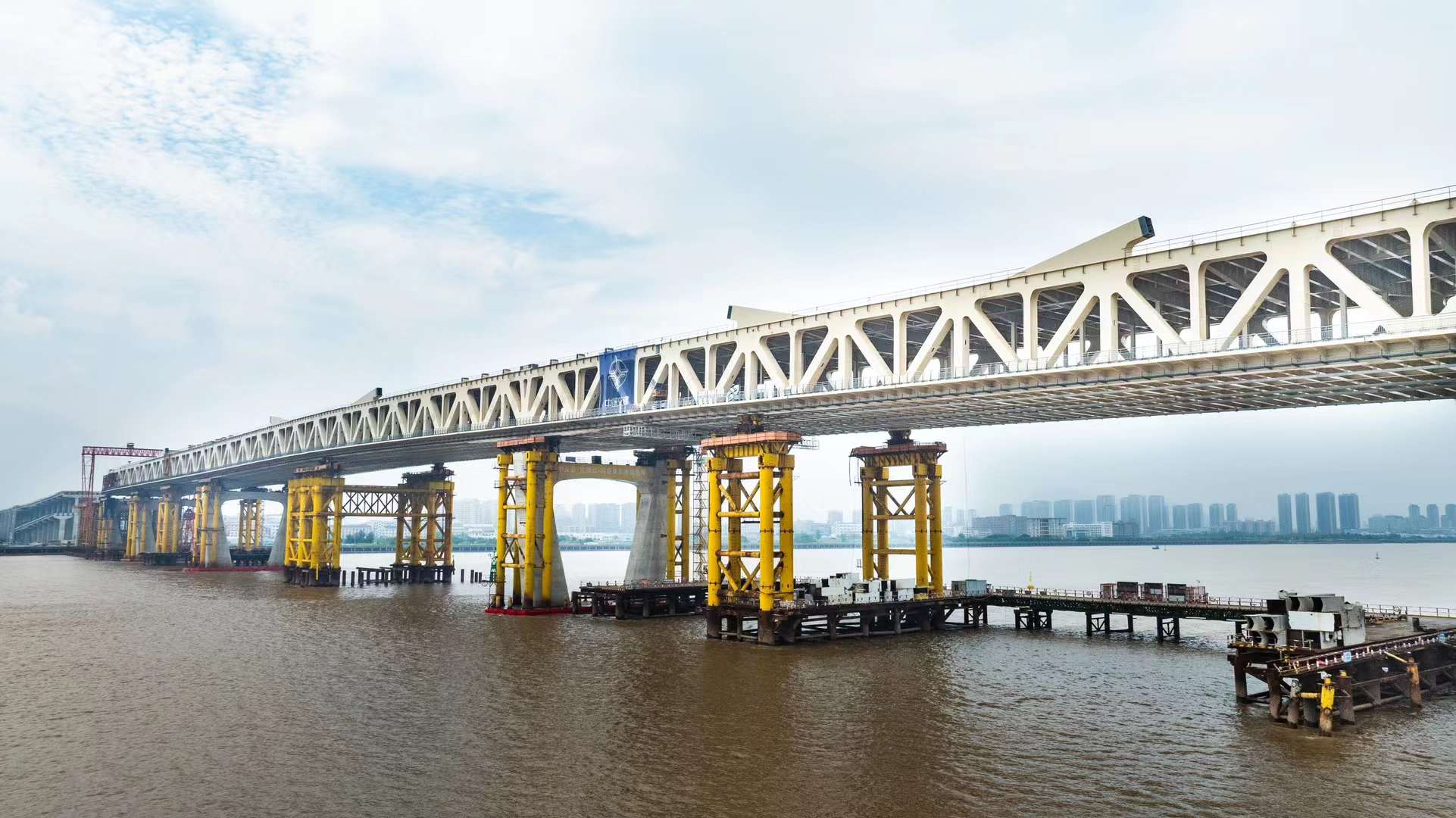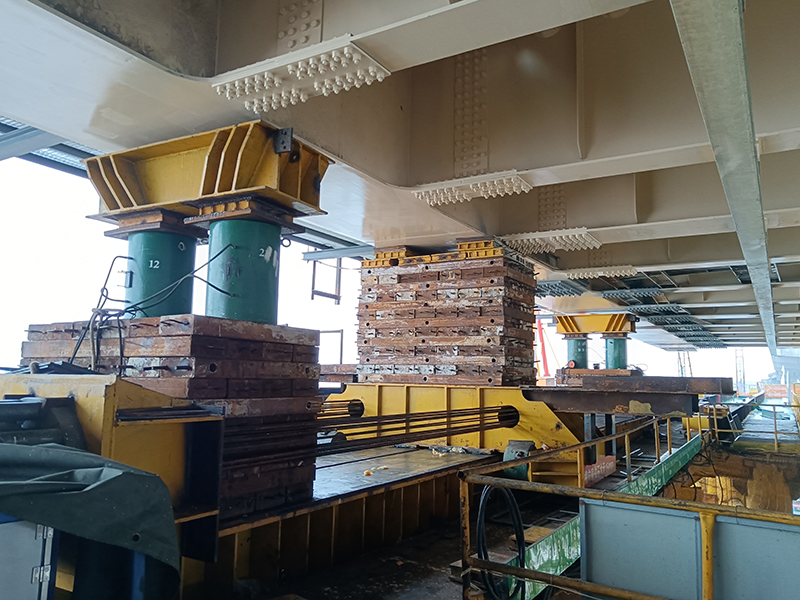 2024年8月28日,國(guó)內(nèi)最大跨度的公軌兩用多塔剛性懸索橋一一浙江瑞安永寧大橋順利合龍。作為大橋建設(shè)的標(biāo)志性節(jié)點(diǎn),為下一步建成通車(chē)奠定了堅(jiān)實(shí)基礎(chǔ)。永寧大橋主橋施工采用雙向頂推施工工藝,其頂推施工最大跨度達(dá)130米,頂推鋼梁總重量達(dá)4.67萬(wàn)噸,臨時(shí)支墩單點(diǎn)支反力最大達(dá)到4270噸;單點(diǎn)抄墊高度達(dá)到3.7米,超過(guò)1層樓的高度,是國(guó)內(nèi)唯一同時(shí)具備最大頂推跨度、最大支點(diǎn)反力、最大抄墊高度三大特點(diǎn)的頂推鋼桁梁橋,綜合頂推施工難度堪稱(chēng)全國(guó)最高。永寧大橋跨江正橋全長(zhǎng)1100m。采用兩端頂推方式,分別在北岸(溫州側(cè))、南岸(平陽(yáng)側(cè))設(shè)置拼裝平臺(tái),然后相向往中間頂推,最后在A29~A30節(jié)間之間合攏。北岸桁梁頂推段全長(zhǎng)342.75m。南岸桁梁頂推段全長(zhǎng)536.25m。頂推時(shí)主橋和引橋簡(jiǎn)支梁之間采用臨時(shí)連接形成連續(xù)結(jié)構(gòu)。