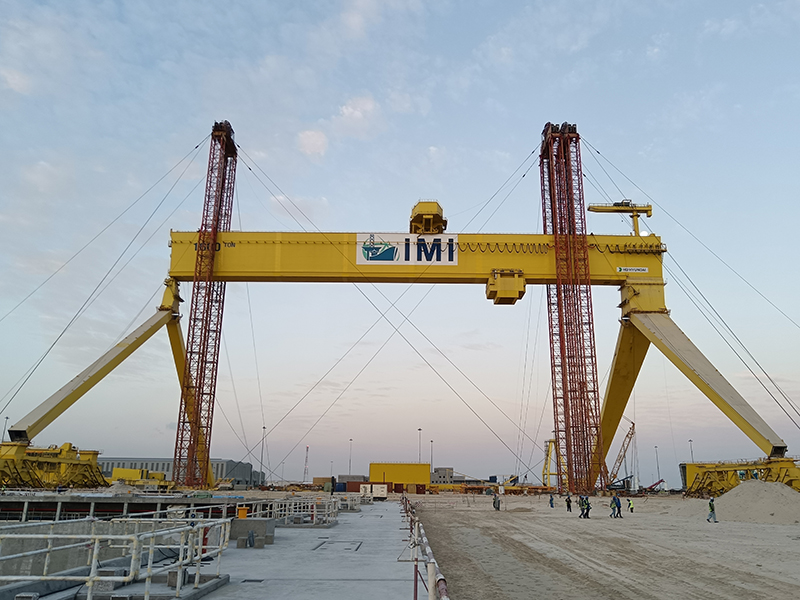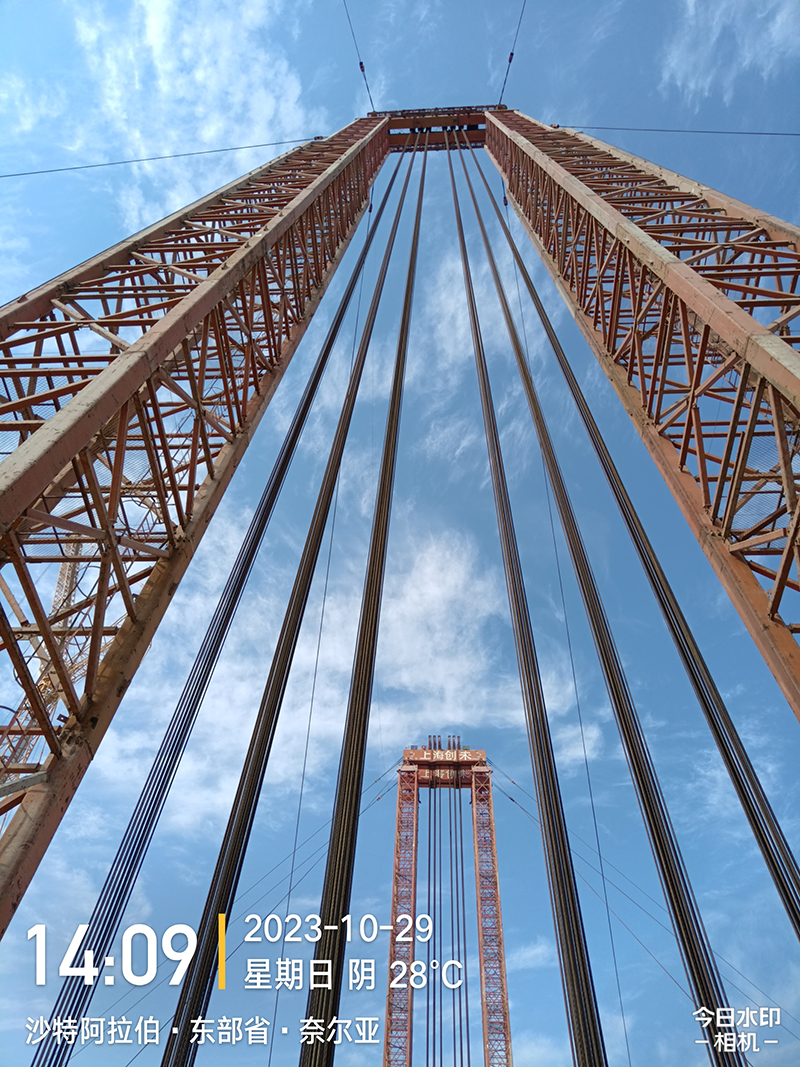10月30日上午,隨著第4臺門式起重機(jī)提升設(shè)備全部拆除完成,標(biāo)志著歷時18個月沙特薩拉曼國王國際港4臺門式起重機(jī)提升安裝全部順利完成。這次提升任務(wù)是1臺1600t×170m門式起重機(jī)和3臺500t×170m門式起重機(jī)提升安裝。1600t門式起重機(jī)最大提升重量5764噸,采用三塔架提升方案,剛腿側(cè)布置兩幅塔架,柔腿側(cè)布置一副塔架,每副塔架頂部設(shè)置6臺560噸提升油缸,共18臺560噸提升油缸,提升高度為113.5米。3臺500t門式起重機(jī)每臺最大提升重量3260噸,采用雙塔架提升方案,每副塔架頂部布置6臺560噸提升油缸,共12臺560噸提升油缸,提升高度為82米。項(xiàng)目團(tuán)隊(duì)開展專項(xiàng)分析和反復(fù)調(diào)研論證,克服了沙漠環(huán)境、極端高溫、吊裝工況復(fù)雜、超重、超高、工藝復(fù)雜等眾多不利因素,采用地面原位拼裝、整體液壓同步提升技術(shù),在確保整體提升過程的安全性和穩(wěn)定性的同時,也大大縮短了施工周期,降低了材料和能源消耗,助力綠色低碳發(fā)展。