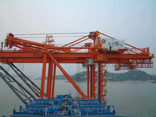 上海振華港機(jī)公司運(yùn)往廈門海天碼頭的集裝箱橋吊在通過廈門海滄大橋時(shí),采取將 T形架升降的工藝降低橋吊高度,以滿足大橋通航凈空的要求。過橋前,通過整體下降將橋吊 T形架放下去,降低橋吊高度;過橋后,通過整體提升將橋吊 T形架拉起來,恢復(fù)正常狀態(tài)。我公司分別在 2002 年 12 月和 2004 年 9 月各完成兩臺(tái)集裝箱橋吊 T形架升降工程。