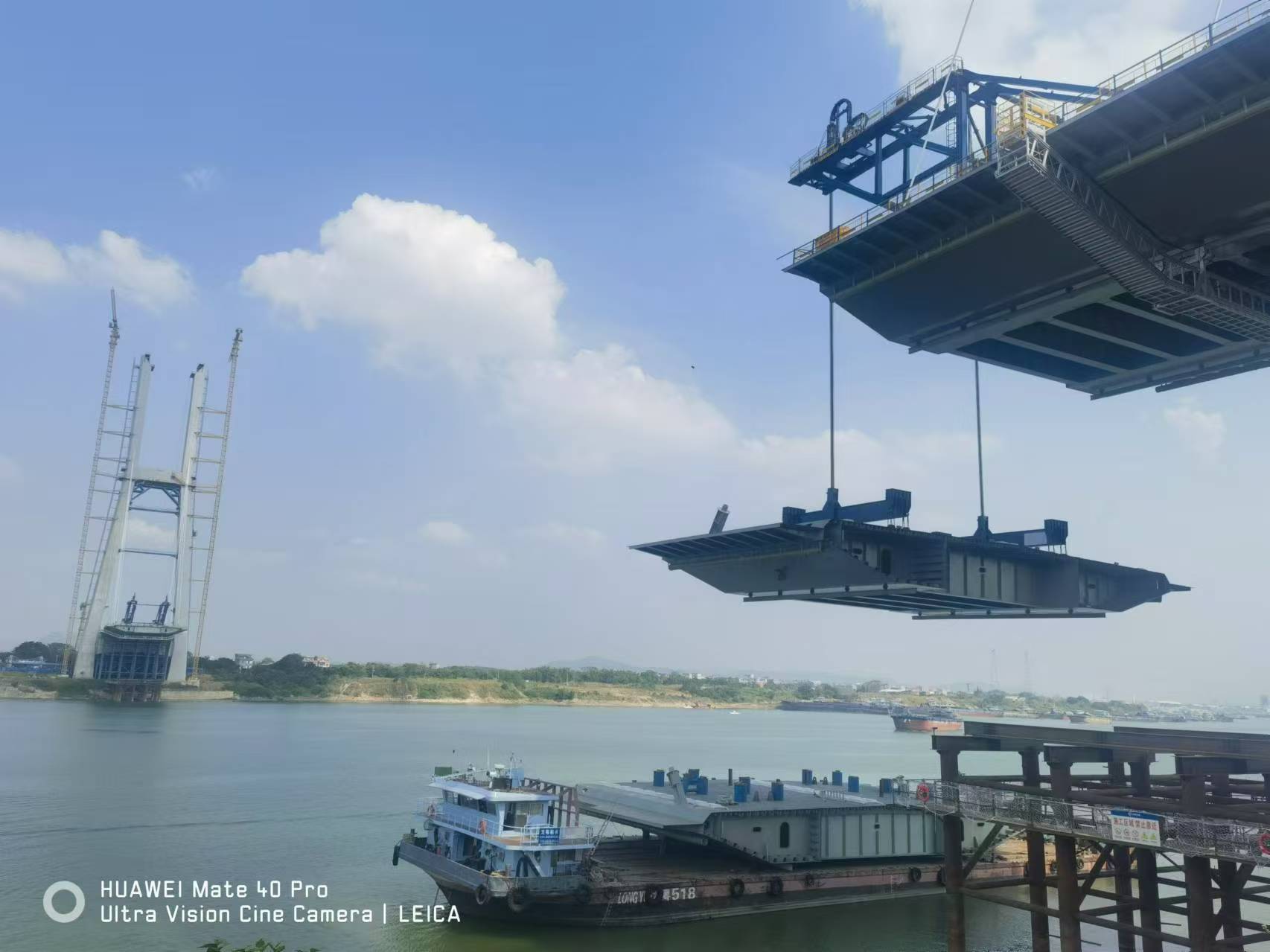 2025年1月17日晚,隨著最后6米合龍段鋼箱梁順利吊裝并精確定位,由同新公司負(fù)責(zé)鋼箱梁節(jié)段提升安裝的平南特大橋順利合龍,為后續(xù)平容高速全線貫通奠定了堅(jiān)實(shí)基礎(chǔ)。平南特大橋全長(zhǎng)2273米,其中主橋橋長(zhǎng)1016米,主橋采用主跨636米鋼箱混合梁斜拉橋,為廣西在建最大跨徑斜拉橋。全橋鋼箱梁節(jié)段分5種類(lèi)型,其中鋼混結(jié)合段2段,過(guò)渡節(jié)段2段,標(biāo)準(zhǔn)節(jié)段36段,合攏段1段,全橋共41個(gè)吊裝分段。公司負(fù)責(zé)41個(gè)節(jié)段受力結(jié)構(gòu)設(shè)計(jì)、計(jì)算和現(xiàn)場(chǎng)提升安裝工作,梁段最大吊裝重量276.6t,單臺(tái)設(shè)備吊重138.3t。采用同新自主研發(fā)JQGqm200t型橋面吊機(jī)4臺(tái)和350t-500mm型提升油缸4臺(tái),該橋面吊機(jī)是采用以液壓提升千斤頂為提升設(shè)備,鋼絞線為力系承載的橋面吊機(jī)。通過(guò)施工方案優(yōu)化整合,工藝創(chuàng)新,分兩岸同時(shí)進(jìn)行提升吊裝。為保證施工進(jìn)度按時(shí)計(jì)劃順利推進(jìn),常駐現(xiàn)場(chǎng)提升技術(shù)人員10人。自2024年9月14日第一吊安裝就位,歷時(shí)124天,順利完成41個(gè)鋼箱梁節(jié)段吊裝作業(yè)。