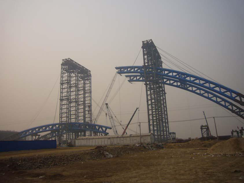 石家莊滹陀河特大橋主拱鋼管拱在安裝時,采取低位拼裝,然后豎轉的安裝方法。