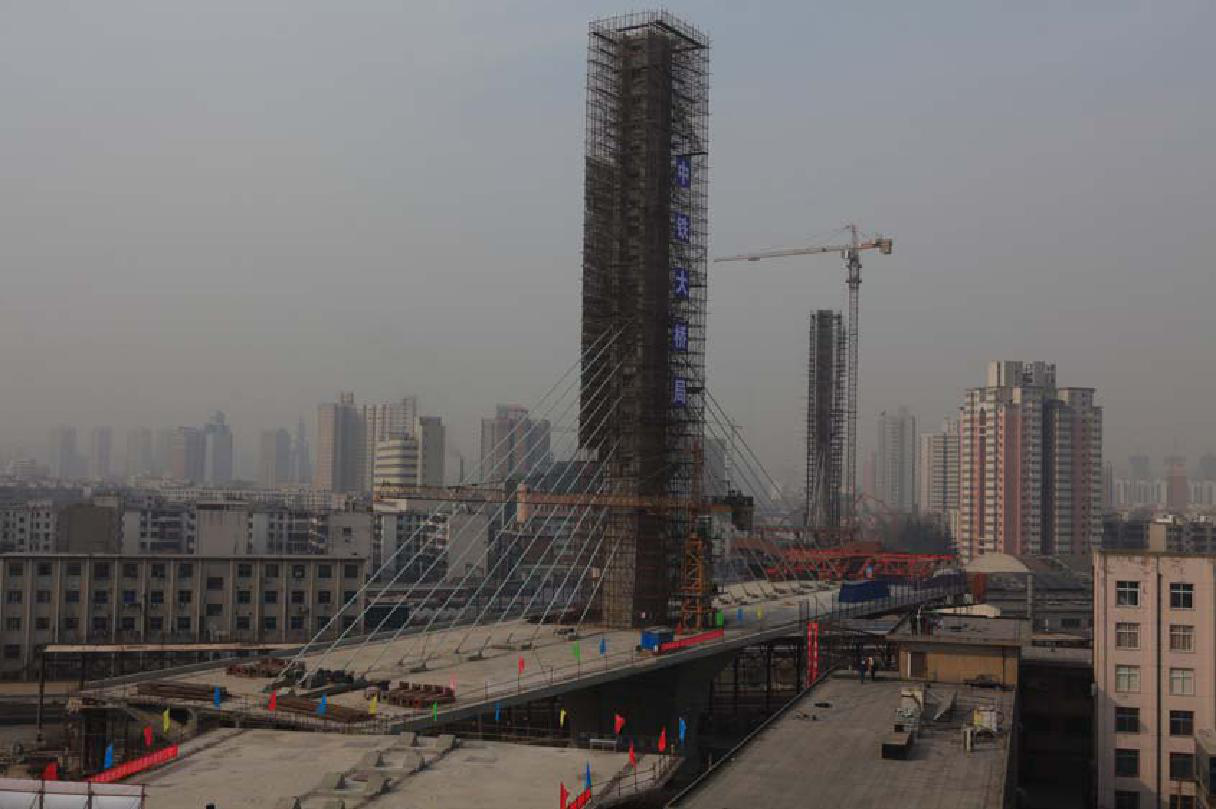 鄭州解放路立交橋,跨鐵路京廣線和隴海線。在主塔及橋面建設(shè)時(shí),采取與京廣線平行拼裝,然后平轉(zhuǎn)施工的工藝。