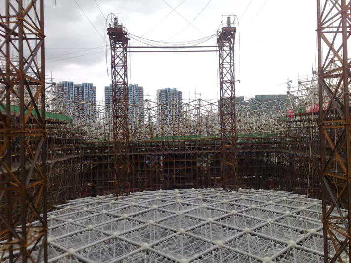 深圳灣體育中心游泳館及體育館網(wǎng)結(jié)構(gòu)網(wǎng)架工程,采取地面拼裝,然后整體提升的施工工藝。