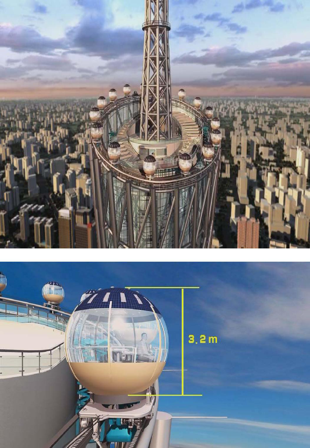廣州新電視塔其主體結(jié)構(gòu)的上端建設(shè)一個(gè)旋轉(zhuǎn)的游樂設(shè)施,游人可以在球形座艙內(nèi)觀看廣州城市的風(fēng)景。其驅(qū)動(dòng)艙采用電機(jī)——齒輪的方式,通過牽引索帶動(dòng)其他艙沿著軌道旋轉(zhuǎn)。