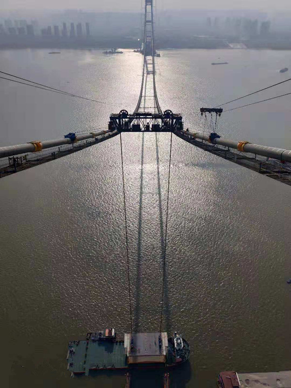 2018年11月15日,隨著兩臺纜載吊機將長36米、寬 32.5米、高10米的鋼梁提升到指定高度,由中鐵大橋院設計、中鐵大橋局施工的武漢楊泗港長江大橋主跨整節(jié)鋼梁架設成功,這標志著跨度雙層公路懸索橋建設取得突破性進展。