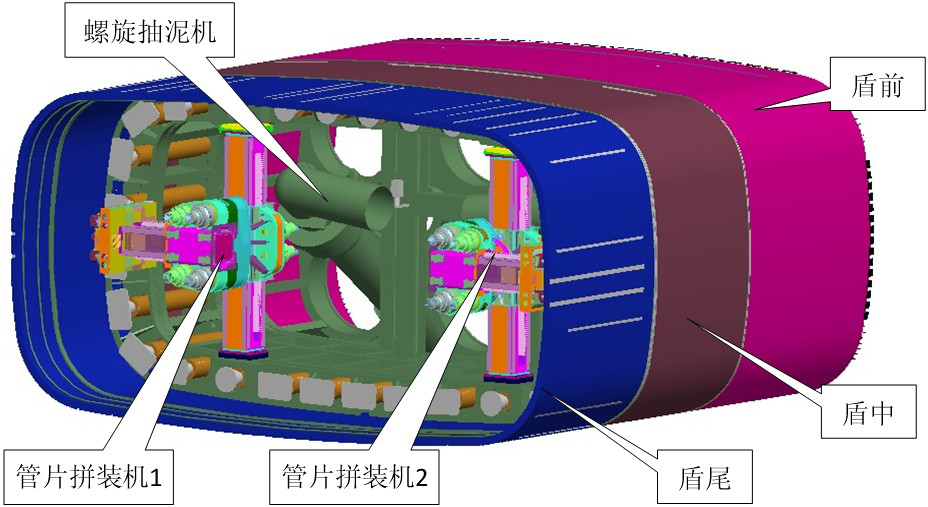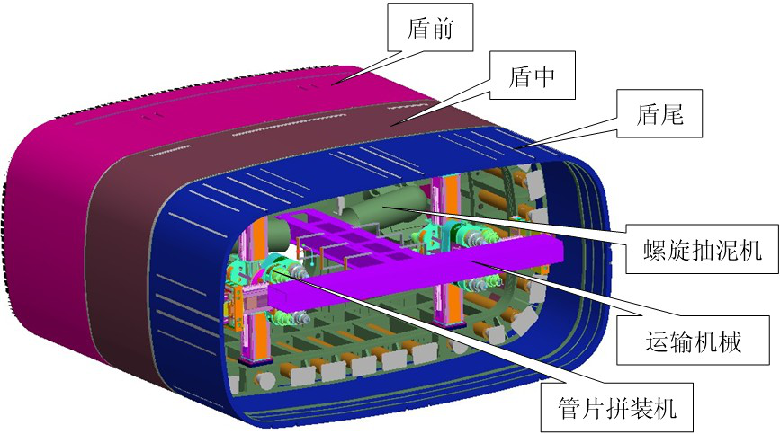 矩形盾構(gòu)機(jī)主要由盾前、盾中和盾尾三大件組成。其中盾前和盾中安裝有螺旋抽泥機(jī)、盾尾安裝有運(yùn)輸機(jī)械和管片拼裝機(jī),如圖1.1所示。