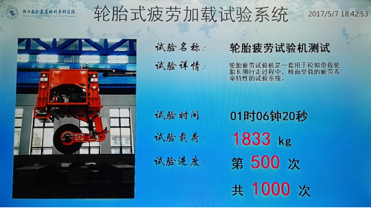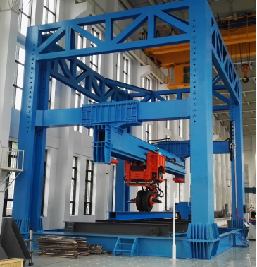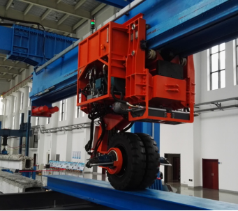 公司受浙江交科院與同濟大學橋梁設計院的委托,研發(fā)了此設備。橋面輪胎式疲勞試驗機用于模擬帶載輪胎長期行走過程中,橋面(試件)受載的疲勞壽命特性。加載部件可選用不同類型輪胎和驅(qū)動方式,模塊化設計,可兩臺同時加載,加載軌道可無限接長。主要技術參數(shù):動態(tài)豎向載荷25t@2Hz;最大速度15km/h;靜態(tài)最大載荷50t;試驗樣件高度可在1m~4.5m范圍內(nèi)調(diào)整。